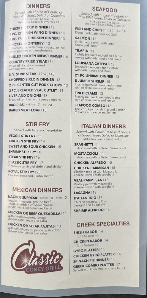 While some experiences may vary—reflecting any bustling diner environment—the overall commitment to customer satisfaction remains strong. With its cozy seating and welcoming décor, Classic Coney Grill embodies the spirit of a small-town diner where memories are made over shared meals. Whether you’re stopping by for a quick bite or settling in for leisurely brunch with family and friends, this restaurant aims to make each visit memorable in every way possible.